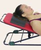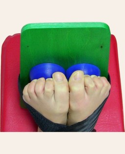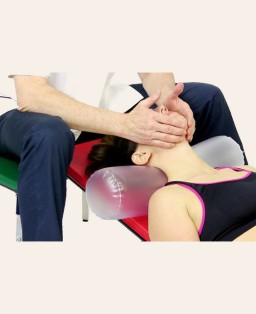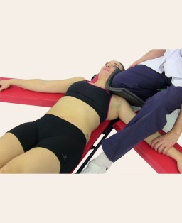 High consistency polyurethane foam pads (made by Postural Service). Created in the most suitable size for use, these accessories can have various functions. Based on the patient's condition, the condition of the neck and the chewing surface in relation to the support surface, the thicknesses can be added, decreased or eliminated. The central hole houses the support of the occiput, making it extremely easy to place the head in the center of Pancafit® in a rigorously decompensated manner. Of fundamental use in the treatment of the transverse chain, the shims can be used as wedges or shims under the popliteals (see photo 4). Their consistency and shape allow the force and impact of the knee to be distributed so that it keeps the shoulder decompensated.